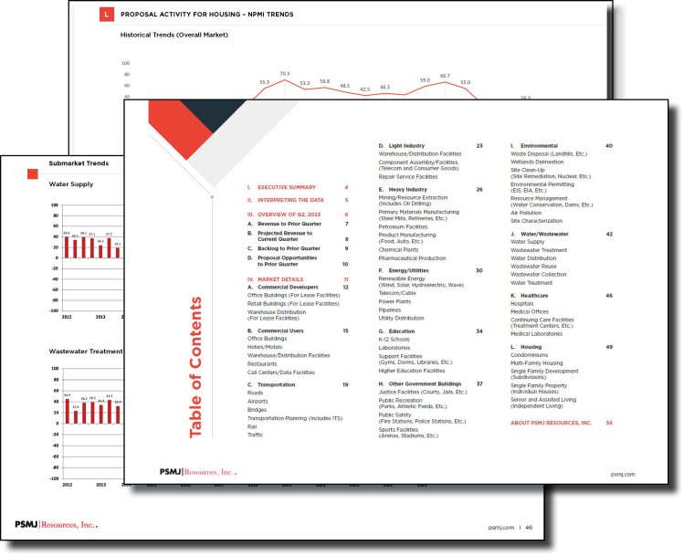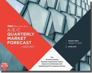Each quarter, PSMJ PRO members get exclusive access to a fresh 65+ page AEC Quarterly Market Forecast Report, the industry's only forward-looking intelligence on which markets and submarkets are heating up and which are cooling, based on survey data from firms nationwide, all collected, analyzed, and explained by PSMJ experts.