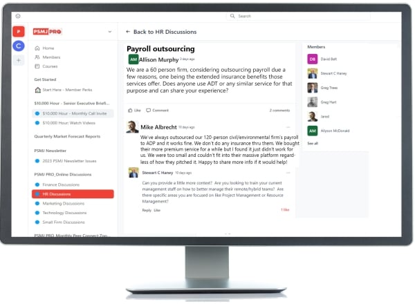 PSMJ PRO is the online business success network just for architecture and engineering firm executives. Membership connects you to expert insights, eye-opening AEC industry data, peer advice, and proven tactics from leaders achieving breakthrough growth and profits.